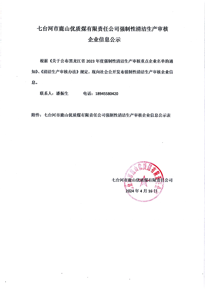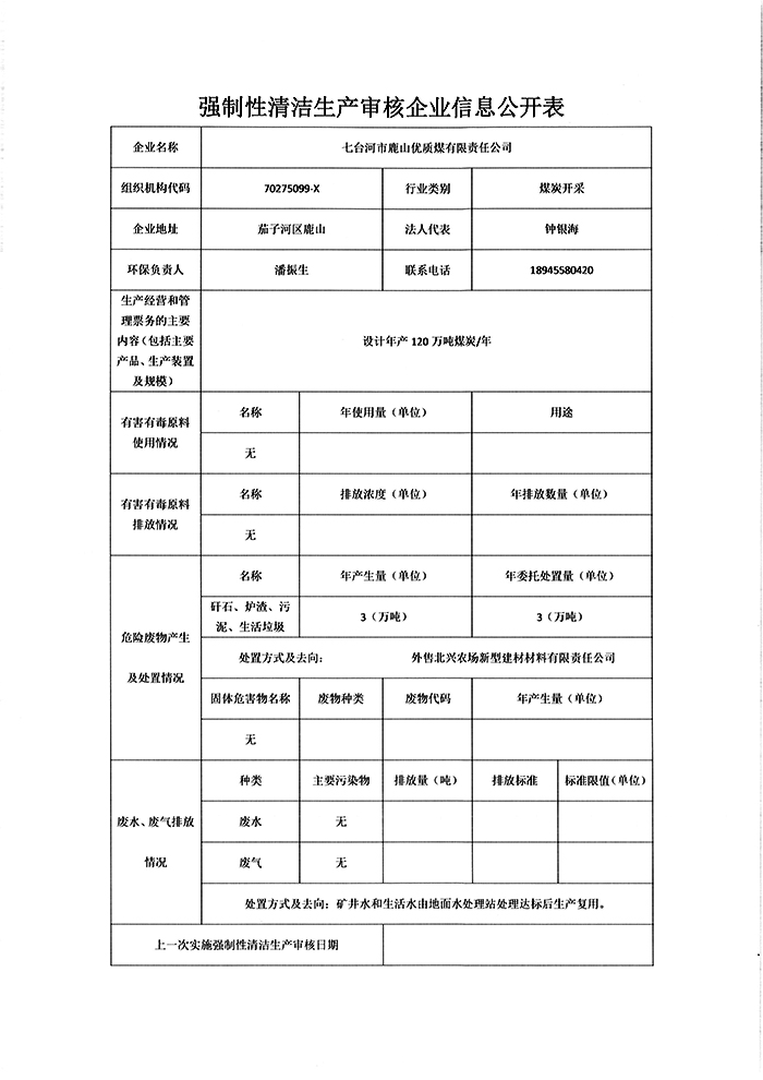 七臺河市鹿山優質煤有限責任公司強制性清潔生產審核企業信息公示